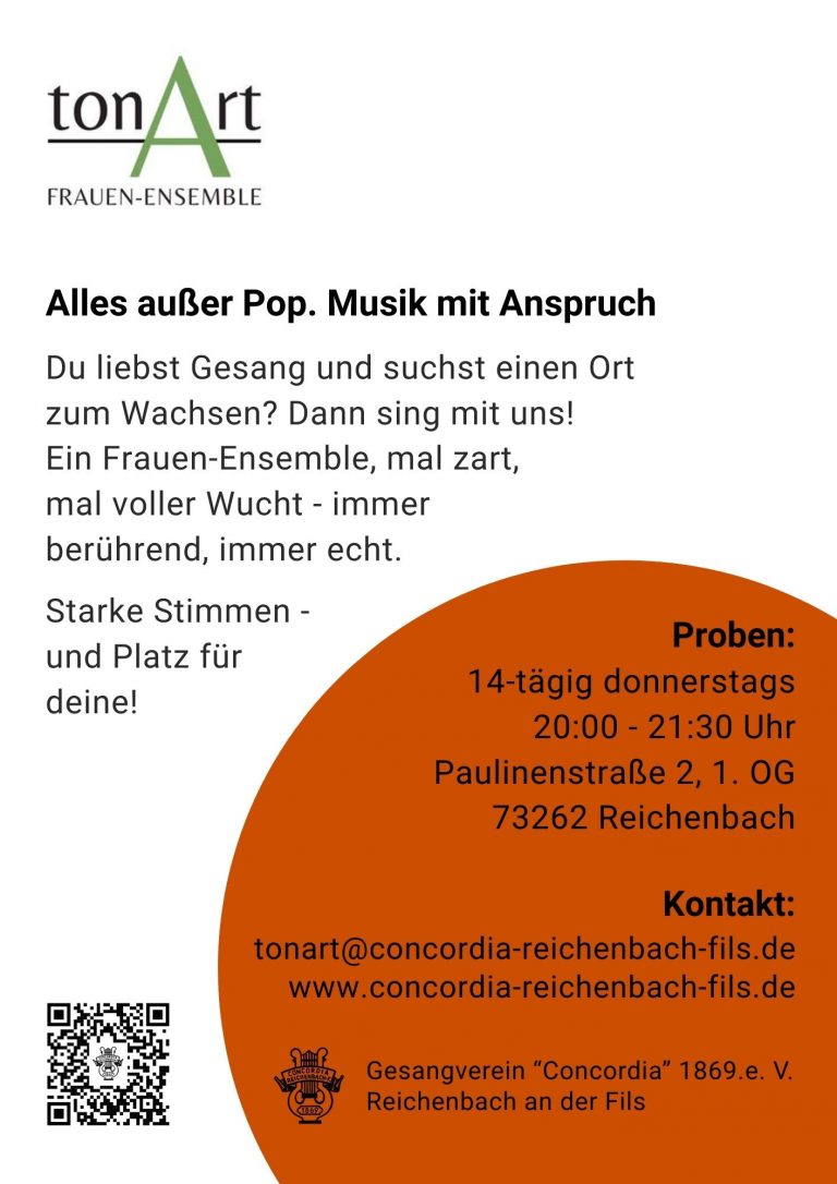 Nähere Informationen bei unserer Chorsprecherin Tanja Deuscher-Nitsche unter 07153 / 55308 oder per Mail unter tonart@concordia-reichenbach-fils.de