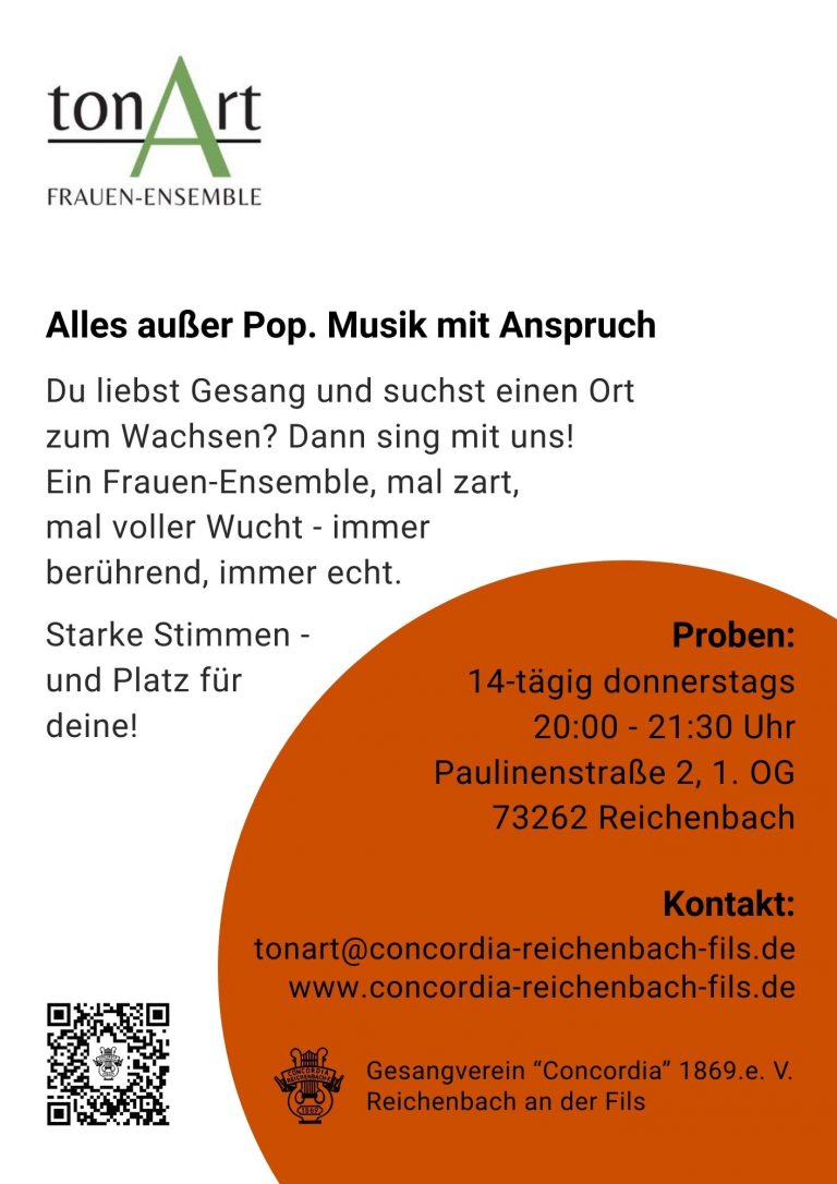 Das FrauenEnsemble tonArt vereint derzeit zehn erfahrene Sängerinnen, die vor allem eines verbindet: die große Freude an der Musik und dem gemeinsamen Singen. Unser Repertoire soll vielfältig werden und von Chorwerken der Renaissance bis zur Moderne reichen. Wir möchten uns volkstümlicher und geistlicher Chormusik ebenso widmen wie Werken aus Oper, Operette und Musical. Darüber hinaus begeistern uns Lieder, die starke Frauenpersönlichkeiten in den Mittelpunkt stellen, wie beispielsweise “Gabriellas Song” – und viele weitere Titel, die Frauen bewegen und inspirieren.